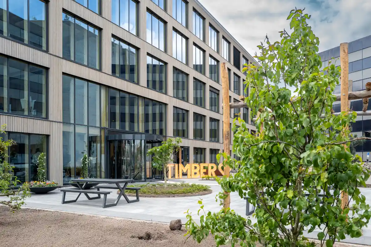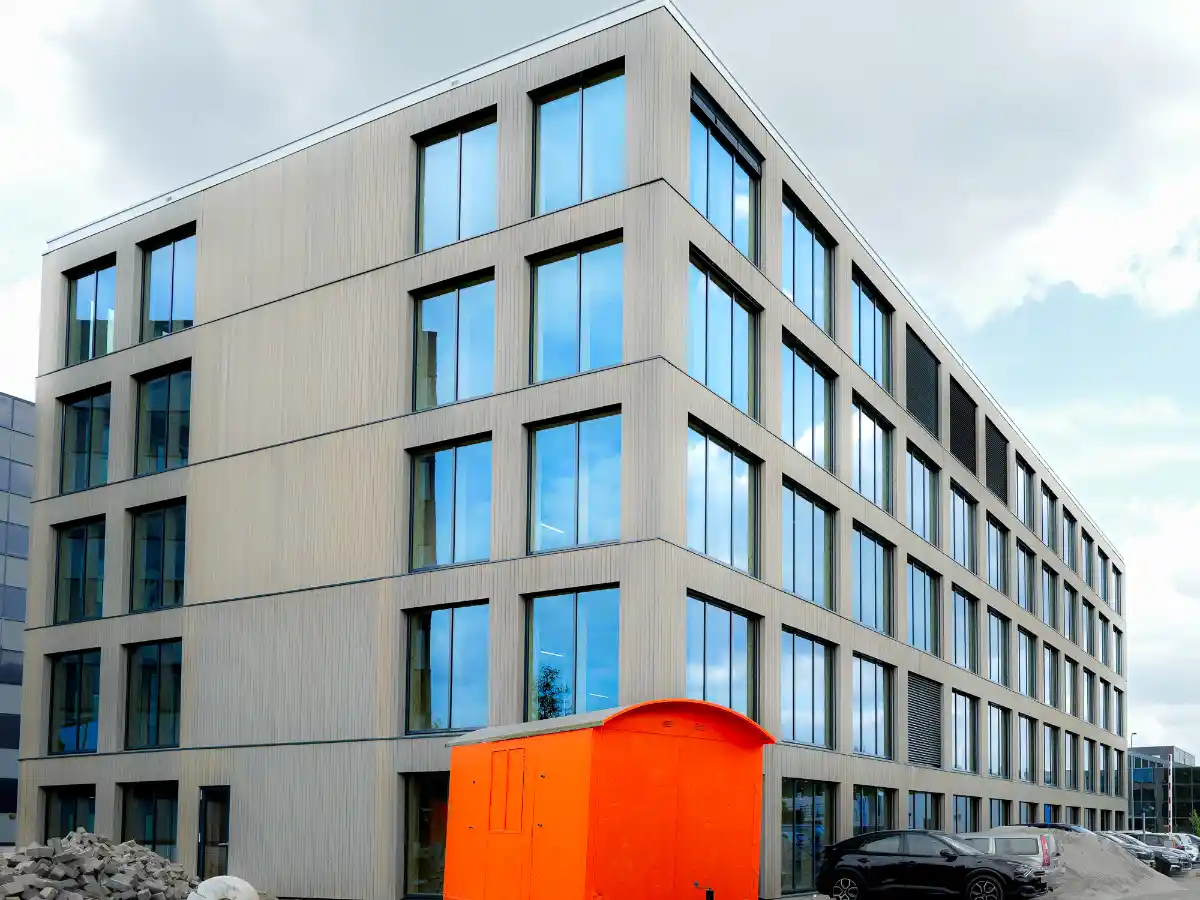 Das neue Bürogebäude am Hambakenwetering 1C erstreckt sich über mehr als 4.000 Quadratmeterund wurde vollständig aus Holz gebaut. Die Holzstruktur und der Einsatz von vorgefertigten Elementen ermöglichten die schnelle Fertigstellung dieses fünfstöckigen Gebäudes. Darüber hinaus speichert das innovative Holzdesign CO₂ und bietet eine wesentlich nachhaltigere Alternative zum traditionellen Betonbau. Noviton Prefab wurde mit der Lieferung und Installation der gesamten Fassade beauftragt.